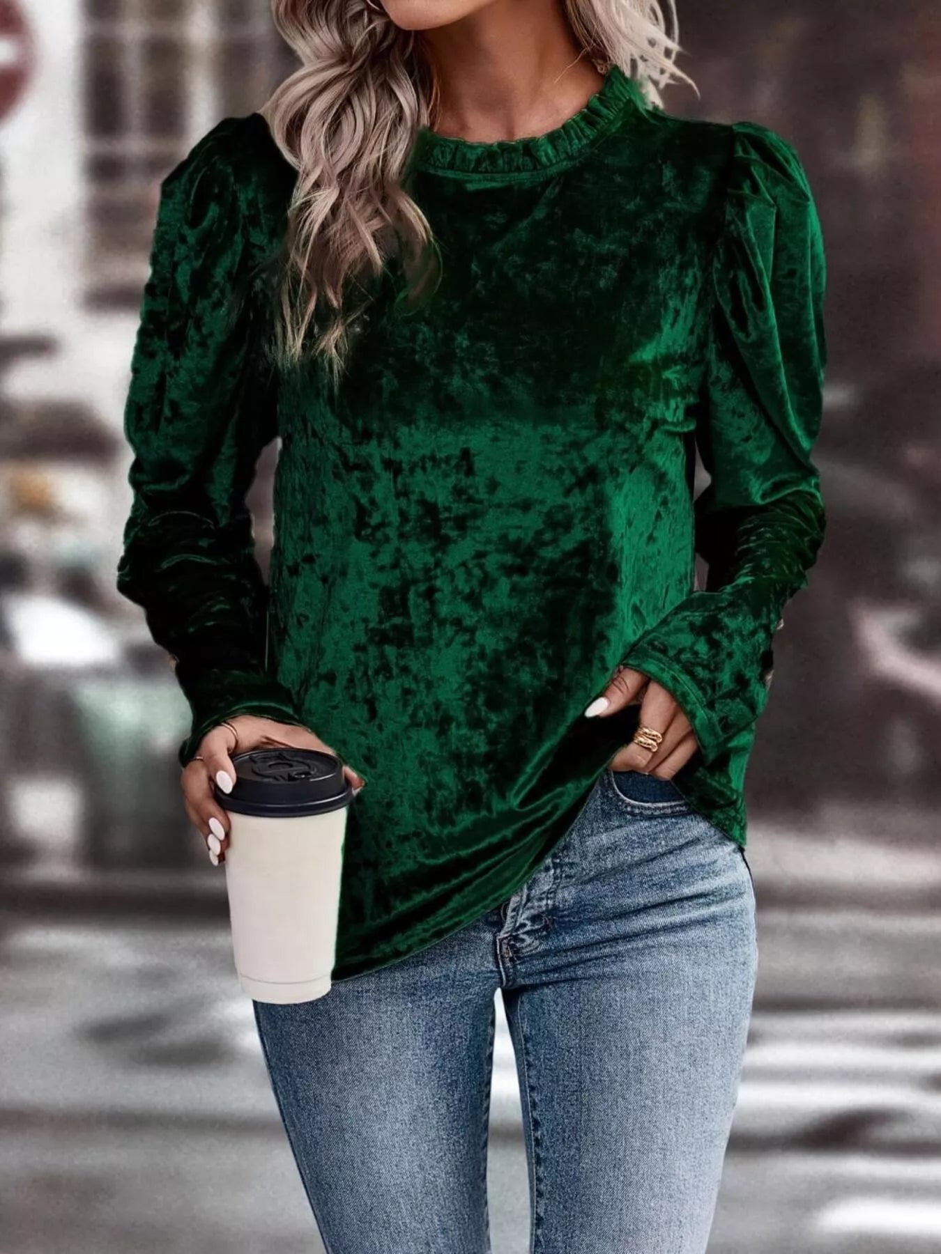 Velvet Frill Mock Neck Puff Sleeve Top